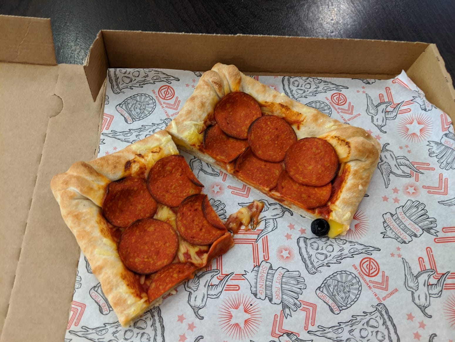 It's a pizzeria-style crust with a ring of melted cheese baked right into the crust The pepperoni was bright against the pale cheese and well dispersed atop the pizza in a way that looked purposeful rather than haphazard